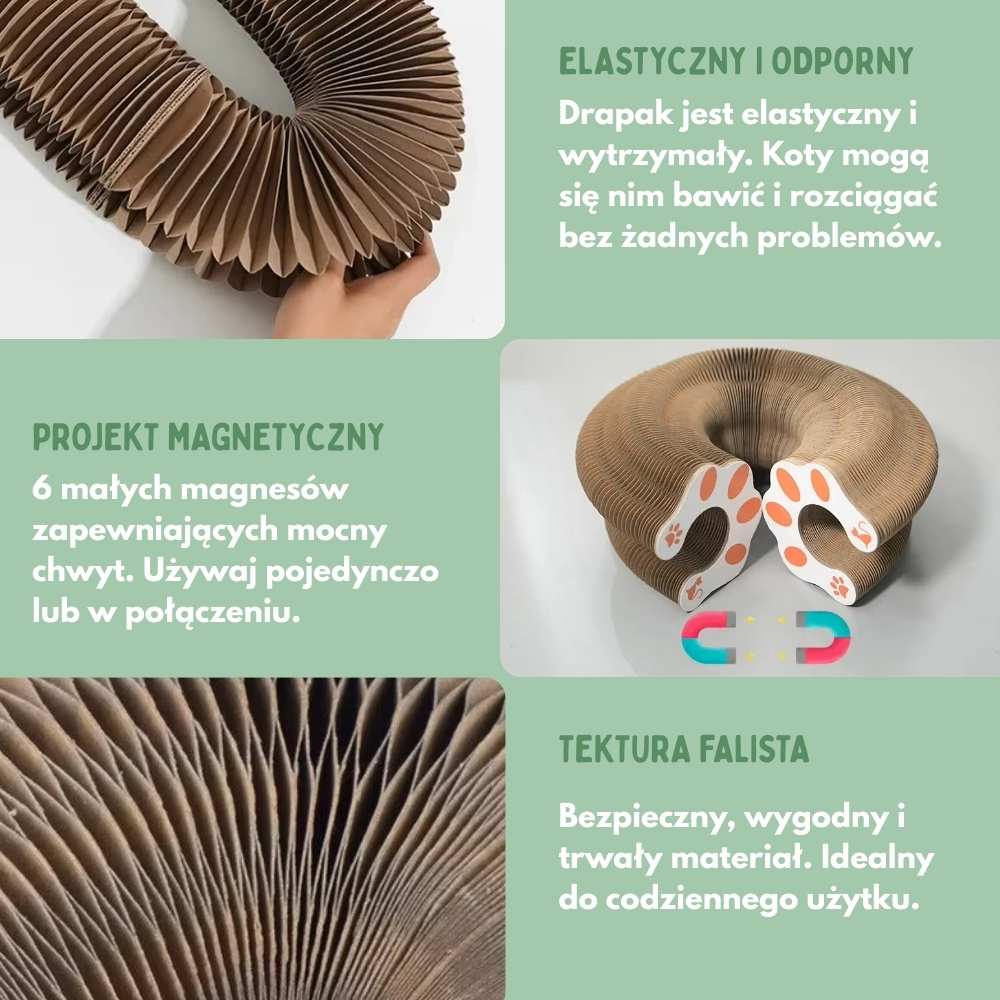 W przeciwieństwie do klasycznej drapaczki, ta losowo zmienia kształt, pobudzając ciekawość kota i czyniąc zabawę bardziej interesującą. Pomaga też przekierować drapanie z daleka od twoich mebli.