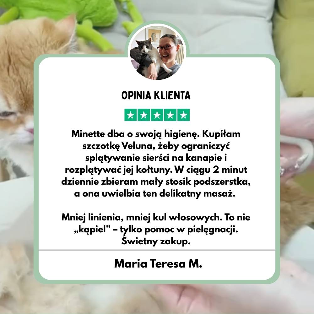 Usuwa martwe włosy, likwiduje naelektryzowanie i masuje skórę kota.